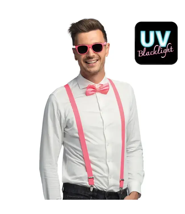 Accessoireset NEON roze | Bretels, bril & strikje – Neonroze feestset met bril, strikje en bretels, voor een opvallende retro look.