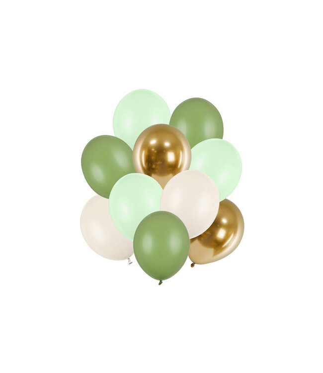Ballonnenmix in groen, beige en goud, set van 10 stuks, ideaal voor een natuurlijke en botanische sfeer. Perfect voor lente-evenementen, tuinfeesten of bruiloften. De zachte kleuren passen goed bij een rustieke decoratiestijl en combineren prachtig met bl