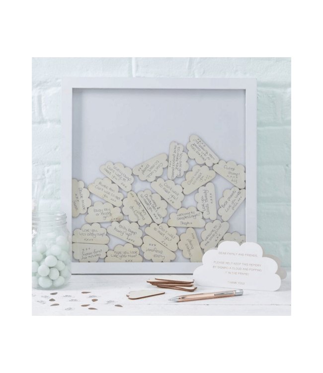 Gastenboek fotolijst met houten wolkjes | Babyshower | Geboorte | Communie – Uniek gastenboek met houten wolkjes voor persoonlijke boodschappen.