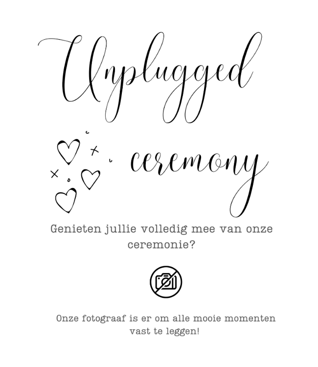 Deze Unplugged ceremony - poster is essentieel bij jullie bruiloft! Laat iedereen weten dat er een fotograaf is en er niemand met de telefoon op jullie prachtige foto's komt te staan.