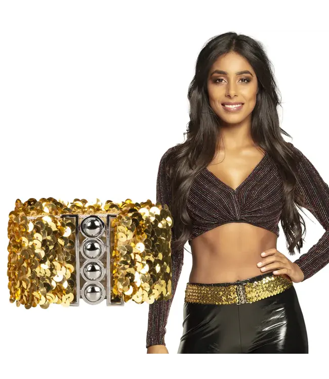 Riem pailletten goud | 60-110 cm stretch x 5 cm – Glanzende elastische riem met gouden pailletten, ideaal voor feestoutfits.