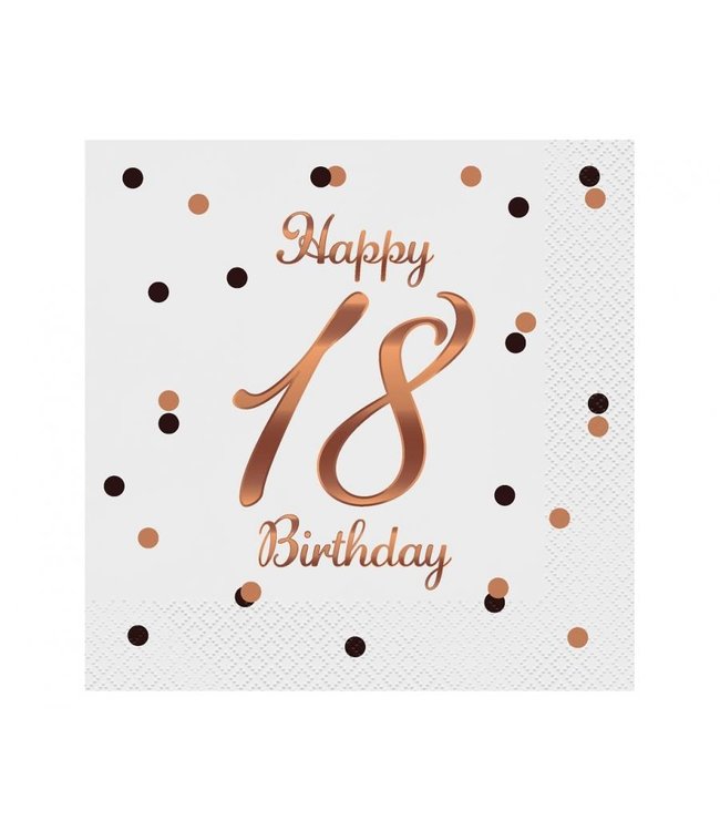 Servetten Happy 18th Birthday (Wit, Rosegoud, 20 stuks) – een feest voor de 18-jarige