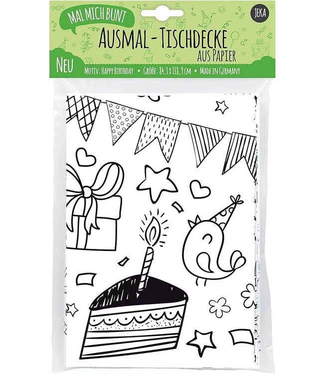 Tafelkleed kleurplaat Happy Birthday - Een vrolijk tafelkleed dat je zelf kunt inkleuren! Ideaal voor kinderfeestjes en creatieve activiteiten.