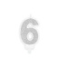 Kaarsje met het cijfer 6 ZILVER. Zet groot op je verjaardagstaart hoe oud je bent geworden! Deze chique taartkaars past op elke taart. Wit met zilveren glitters