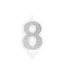 Kaarsje met het cijfer 8 ZILVER. Zet groot op je verjaardagstaart hoe oud je bent geworden! Deze chique taartkaars past op elke taart. Wit met zilveren glitters